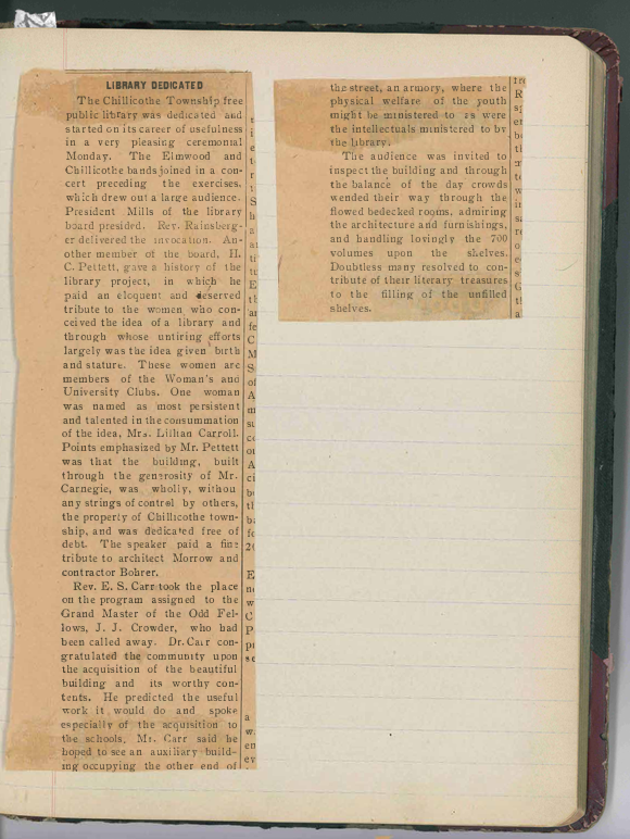 To meet their aim, one of the first orders of business for the new library board was to find a proper location on which to build. From the official library minutes, a “Mr. Mathews” had proposed the sale of “the west 130 ft. of lot one (1) in block three (3) in the original town, now City of Chillicothe, for the sum of $1,200”. That proposition was accepted unanimously by the Board of Trustees.