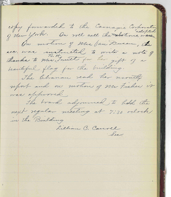 That same year, the Board started communicating with the Carnegie Corporation of New York to discuss procuring funds for a library building. They also began correspondences with various architects familiar with the Carnegie Corporation specifications for library buildings. As noted in the minutes “Letters were read from nine architects, from New York City, Chicago, Kansas City, Lafayette, IN, Galesburg, and Peoria.”
