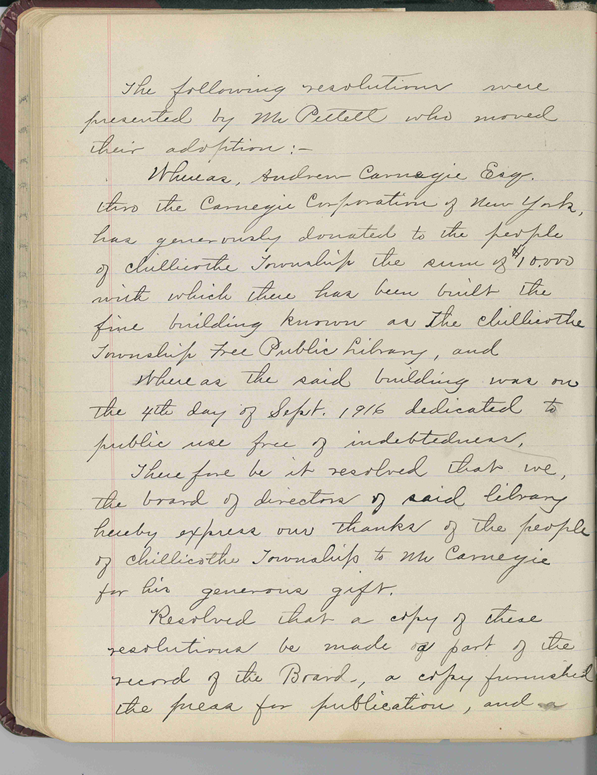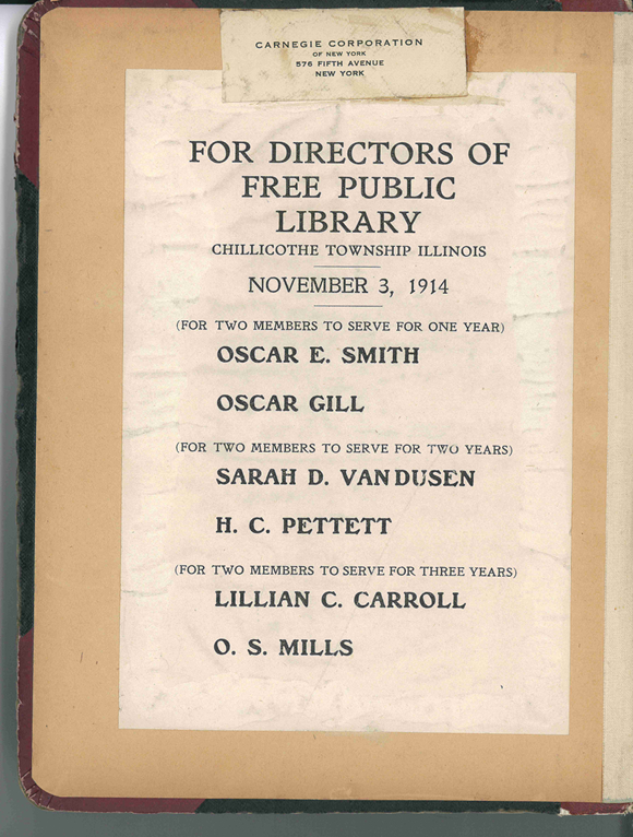 The first public library to serve the community of Chillicothe was formed in 1914, and called the Free Public Library. The first meeting date for the board of directors was held on November 3, 1914 (a copy of the original notice is attached), and because there was no formal building (yet) the Trustees met in the office of a “Mr. H.C. Pettett” (who was an attorney).